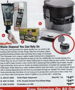 Quem nunca acampou porque precisa de uma privada limpinha? E tudo foi pensado! Papel higiênico com embalagem resistente a água e gancho que permite pendurar até mesmo em árvores. E a praticidade da sacolinha interna da privada que transforma resíduos líquidos (xixi!) em gel?